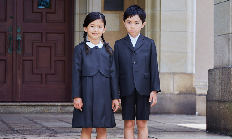 ・ ジャケット + 白シャツ + 半ズボン ・ ジャケット + 白シャツ + 半ズボン + 無地のベスト ・ ジャケット + ネクタイ + 白シャツ + 半ズボン 黒や紺などきちんとしたスーツを着用しましょう。足元は白い靴下に革靴(ローファー)を合わせて緊張感ある服装が好まれます。 |